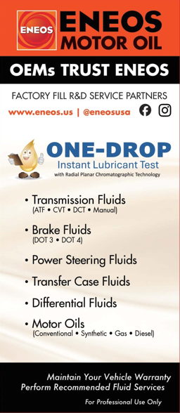 ENEOS, OEM manufacturer of motor oils for Asian vehicles, has partnered with ONE-DROP Instant Lubricant Test to bring real-time fluid condition testing to your shop.
